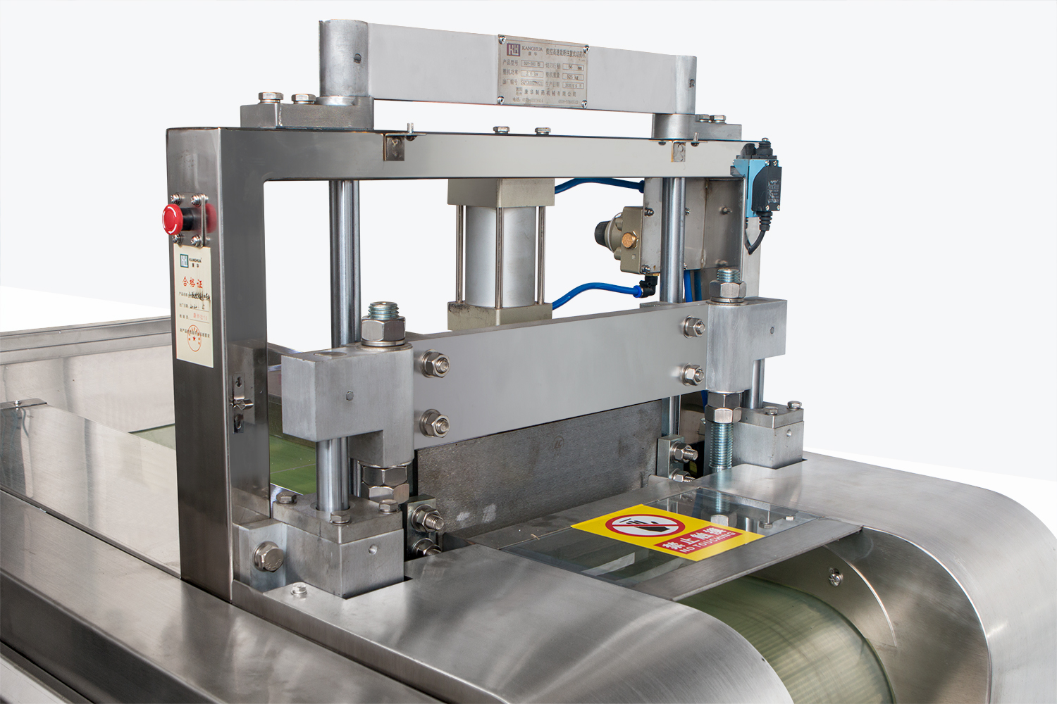 特制的輸送帶和壓料機(jī)構(gòu)將物料按設(shè)定的長度,作步進(jìn)平行移動(dòng),垂直上下往復(fù)運(yùn)動(dòng)的切刀機(jī)構(gòu)直接在輸送帶上切斷物料。