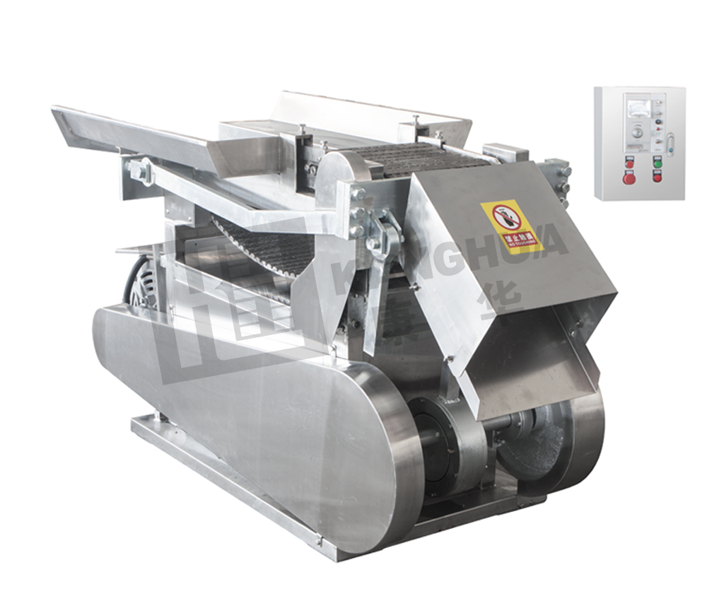采用機(jī)械偏心機(jī)構(gòu)傳動(dòng),使刀片上下往復(fù)運(yùn)動(dòng),原料經(jīng)輸送鏈送至刀門,切制成所需要厚度的飲片。