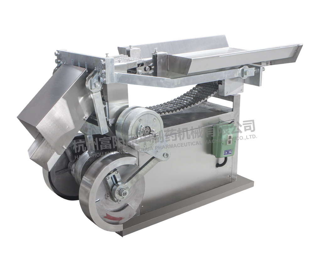采用機(jī)械偏心機(jī)構(gòu)傳動(dòng),使刀片上下往復(fù)運(yùn)動(dòng),原料經(jīng)輸送鏈送至刀門,切制成所需要厚度的飲片。